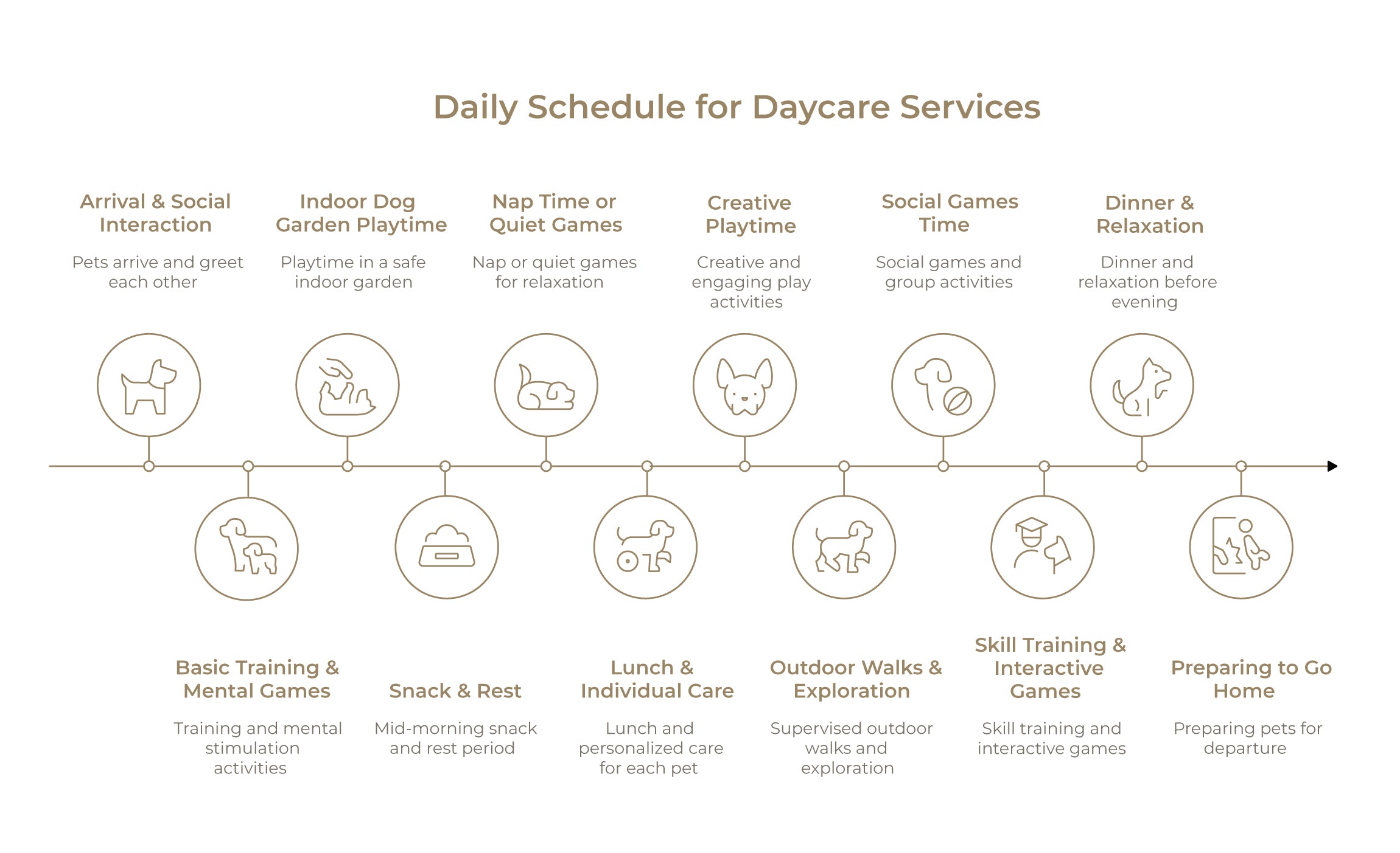 Pets will engage in various activities, including interactive play sessions, nature walks, obstacle courses, and relaxation periods.